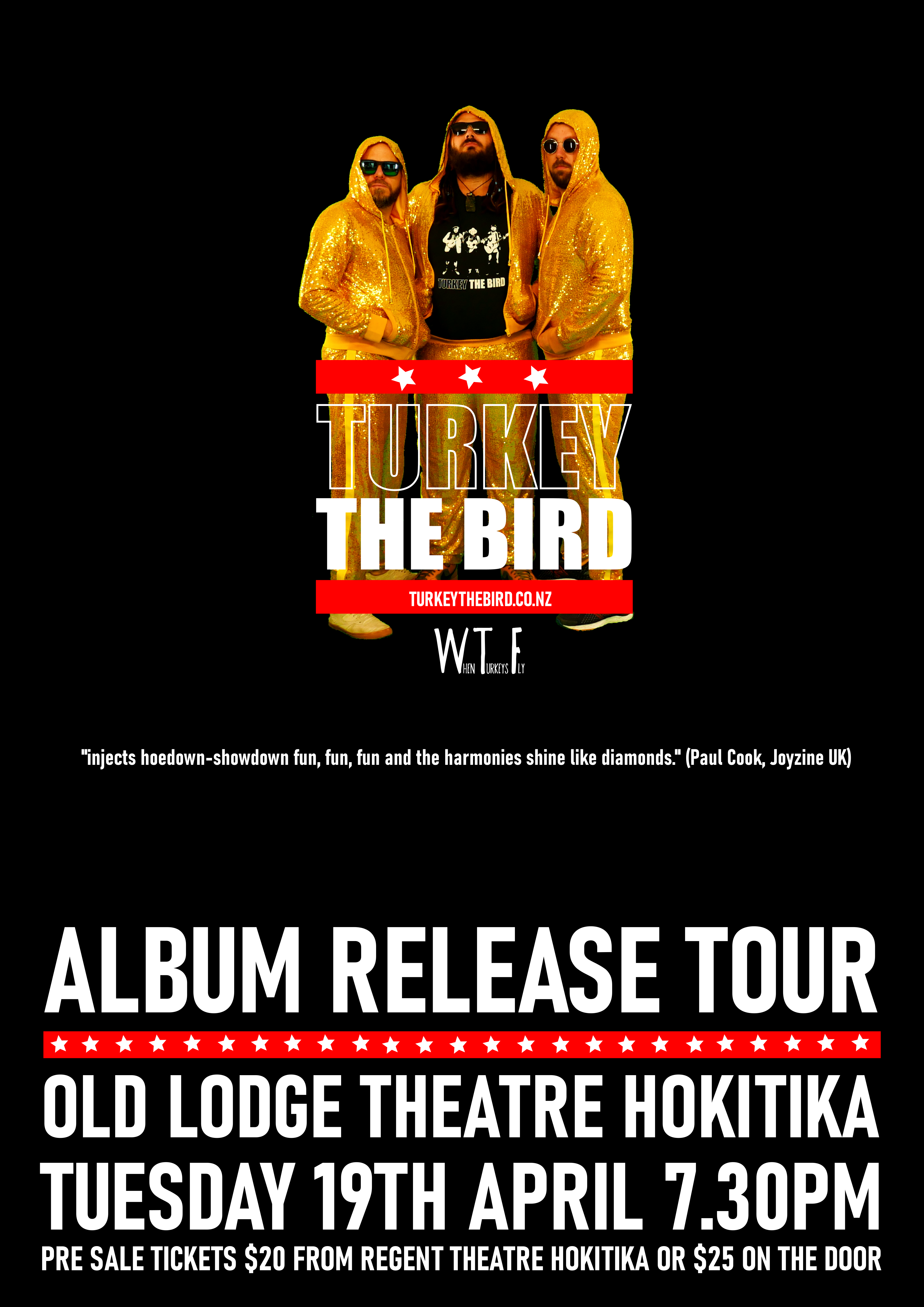See their Facebook event here Old Lodge: Tuesday 19th Apr: 7.30pm. TICKETS: $20 presale from Regent Theatre. Purchase tickets at: www.hokitikaregent.com/movie/turkey-the-bird Door sales $25 New Zealand’s folk trio “Turkey The Continue Reading